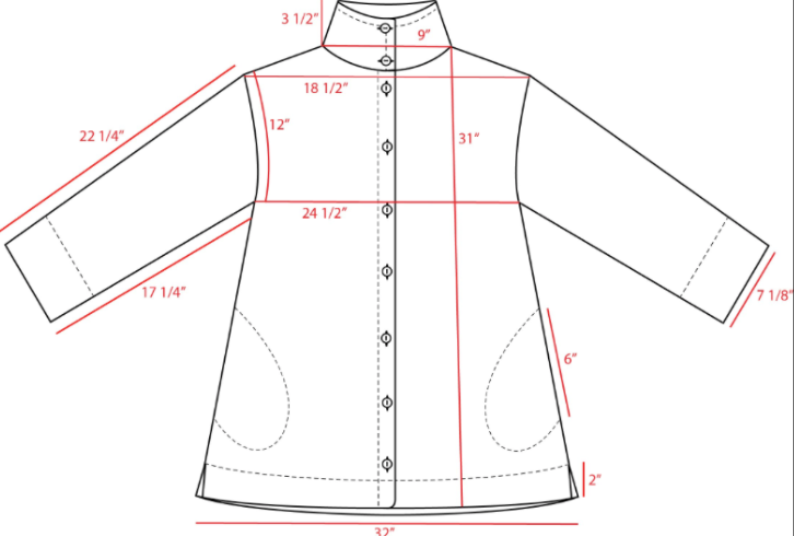 There is a 2" clean finished hem with side vents, side hidden pockets stitched in place for a clean finish and shell buttons.
