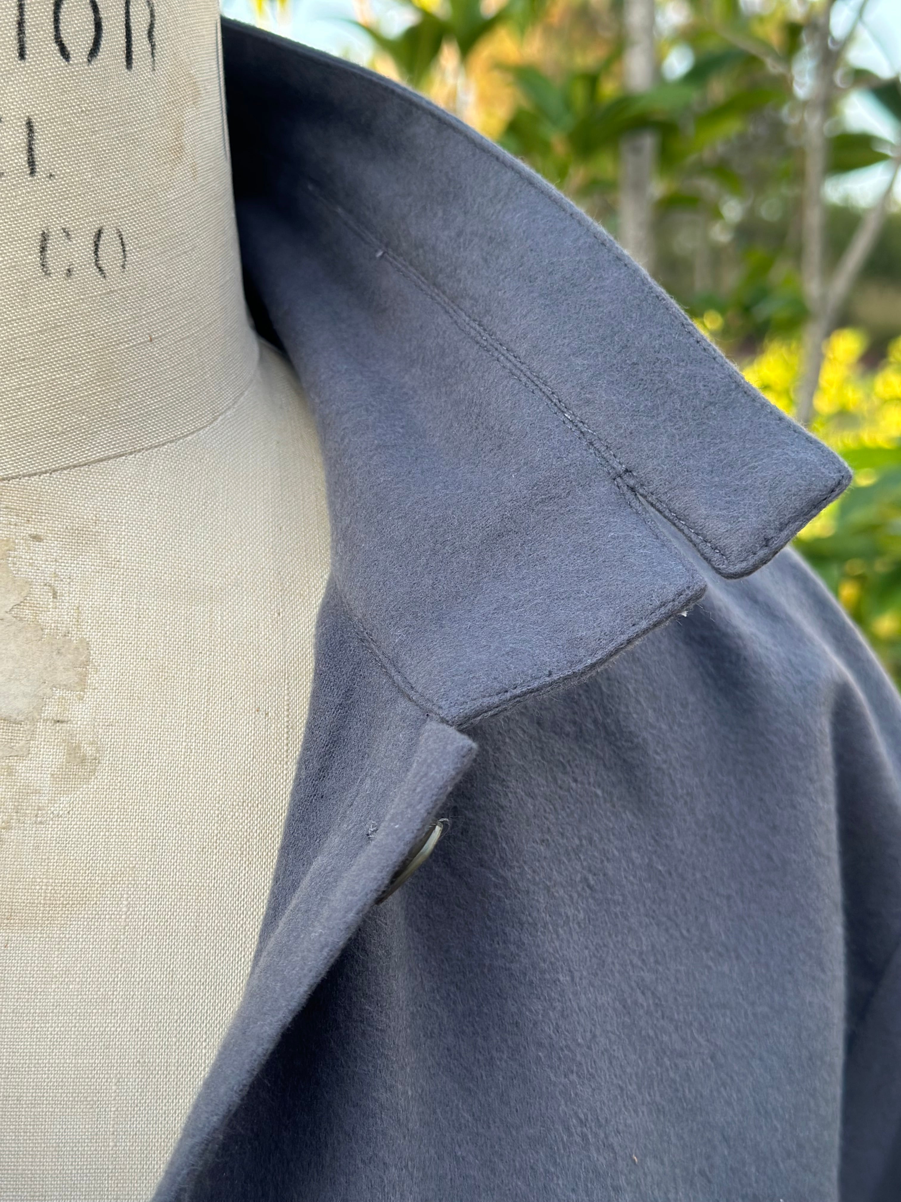 There is a 2" clean finished hem with side vents, side hidden pockets  stitched in place for a clean finish and shell buttons.