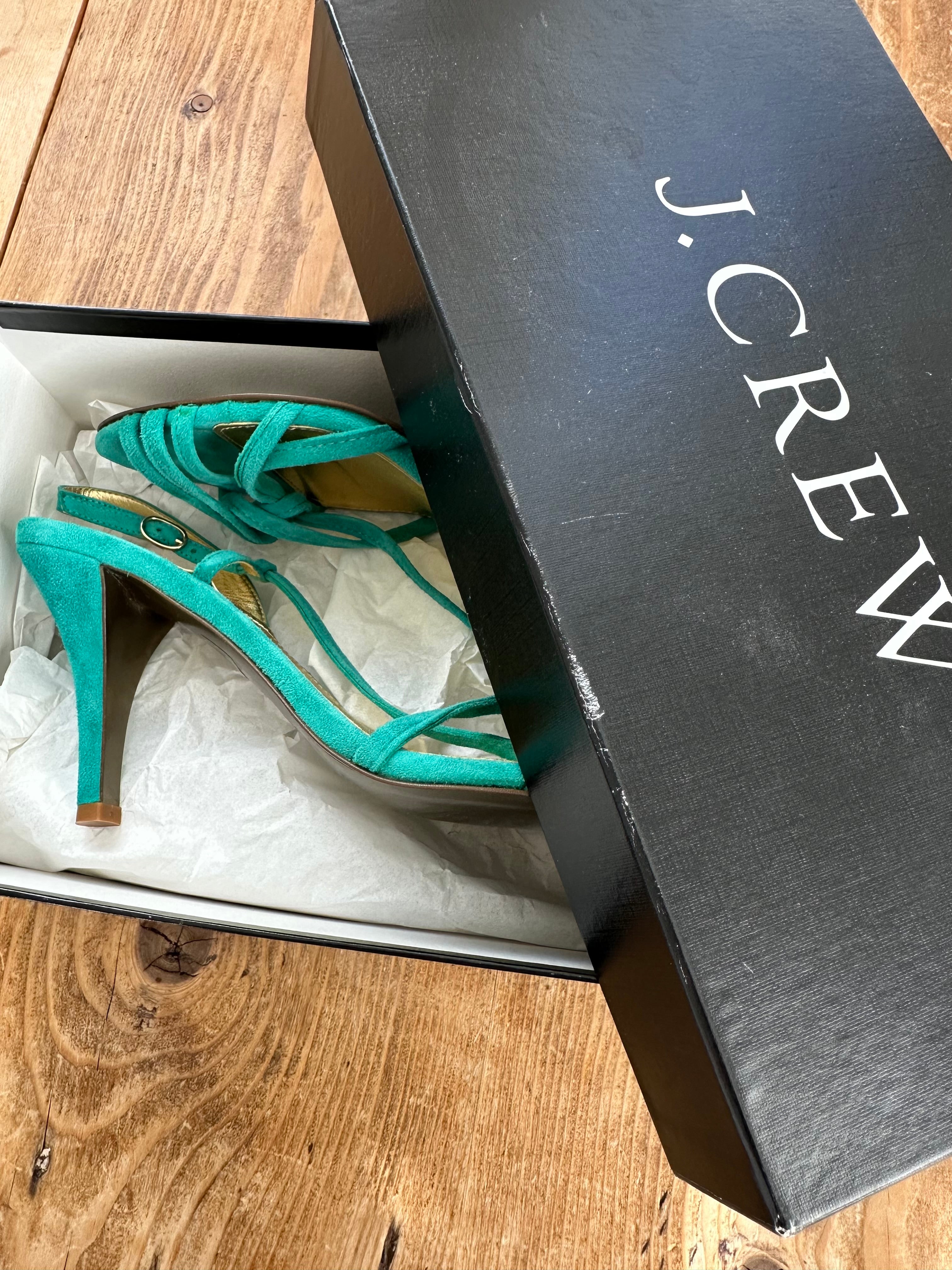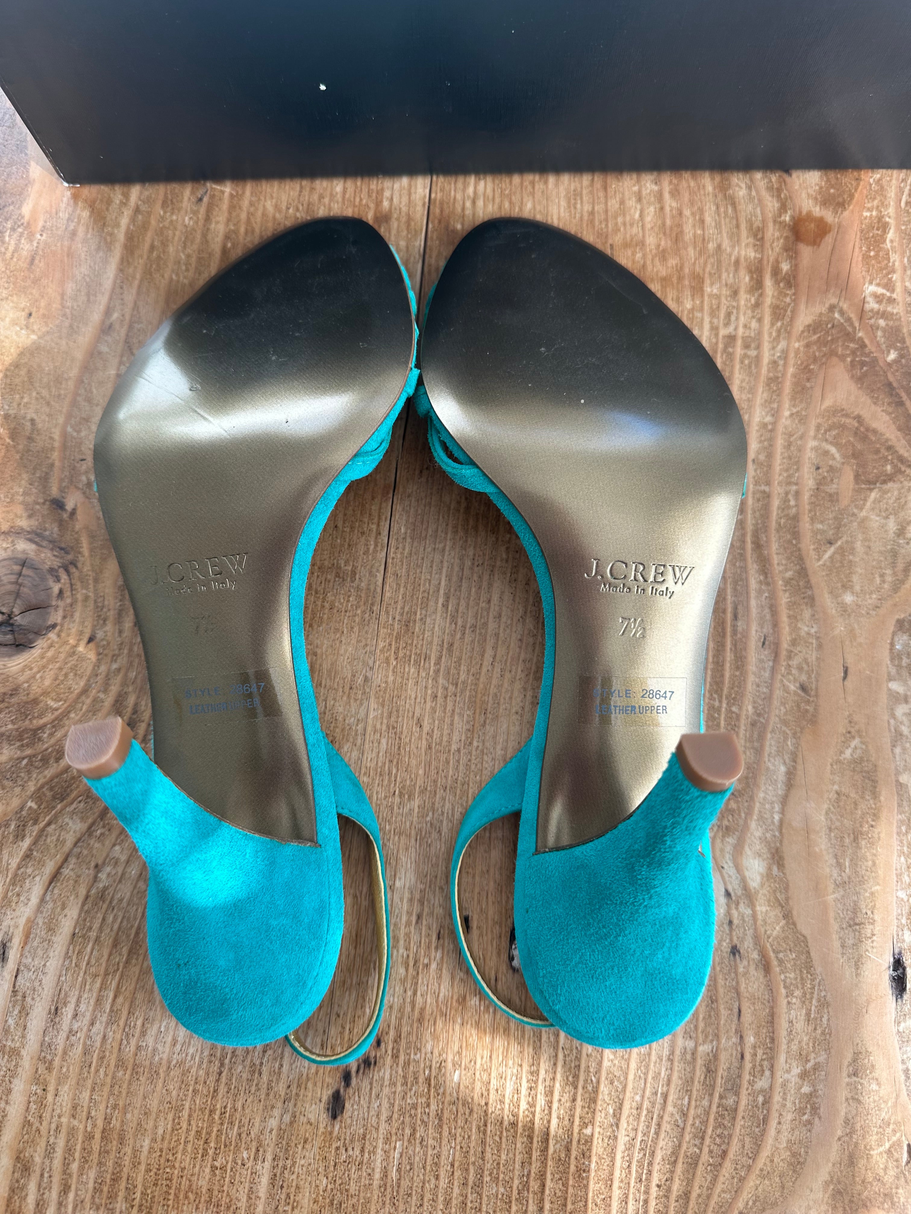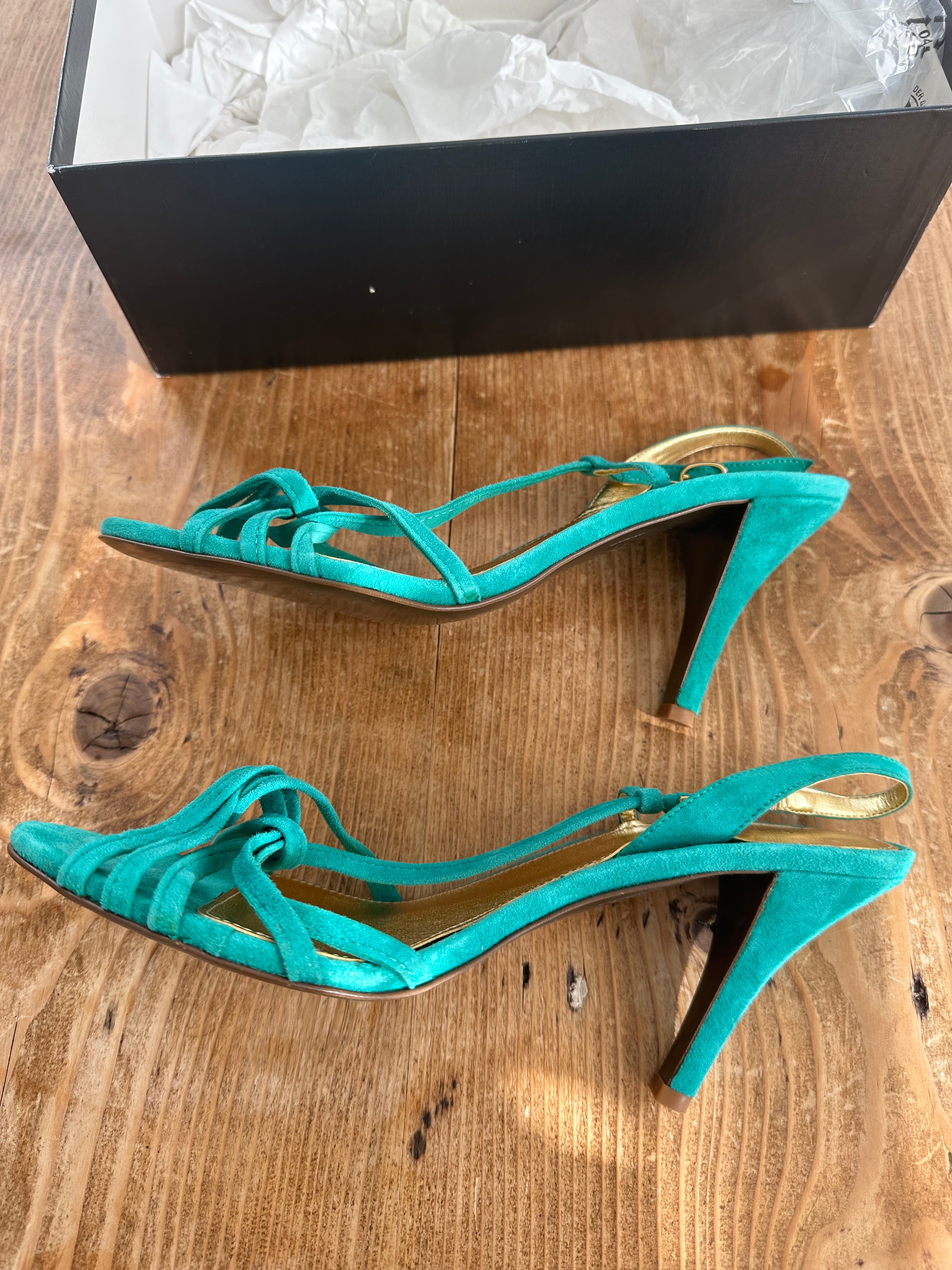 I think these shoes are a sweet treasure.. Turquoise suede strappy heels. They are in perfect condition and only worn once. See photos on condition of souls.